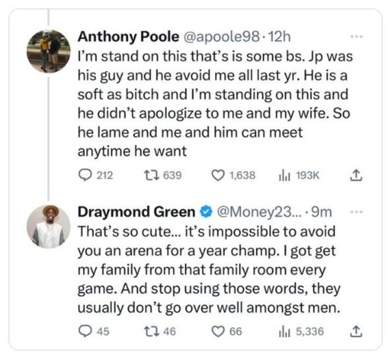 In a response to Poole’s message, Draymond Green then tweeted: “That’s so cute… it’s impossible to avoid you an arena for a year champ. I got get my family from that family room every game. And stop using those words, they usually don’t go over well amongst men.”